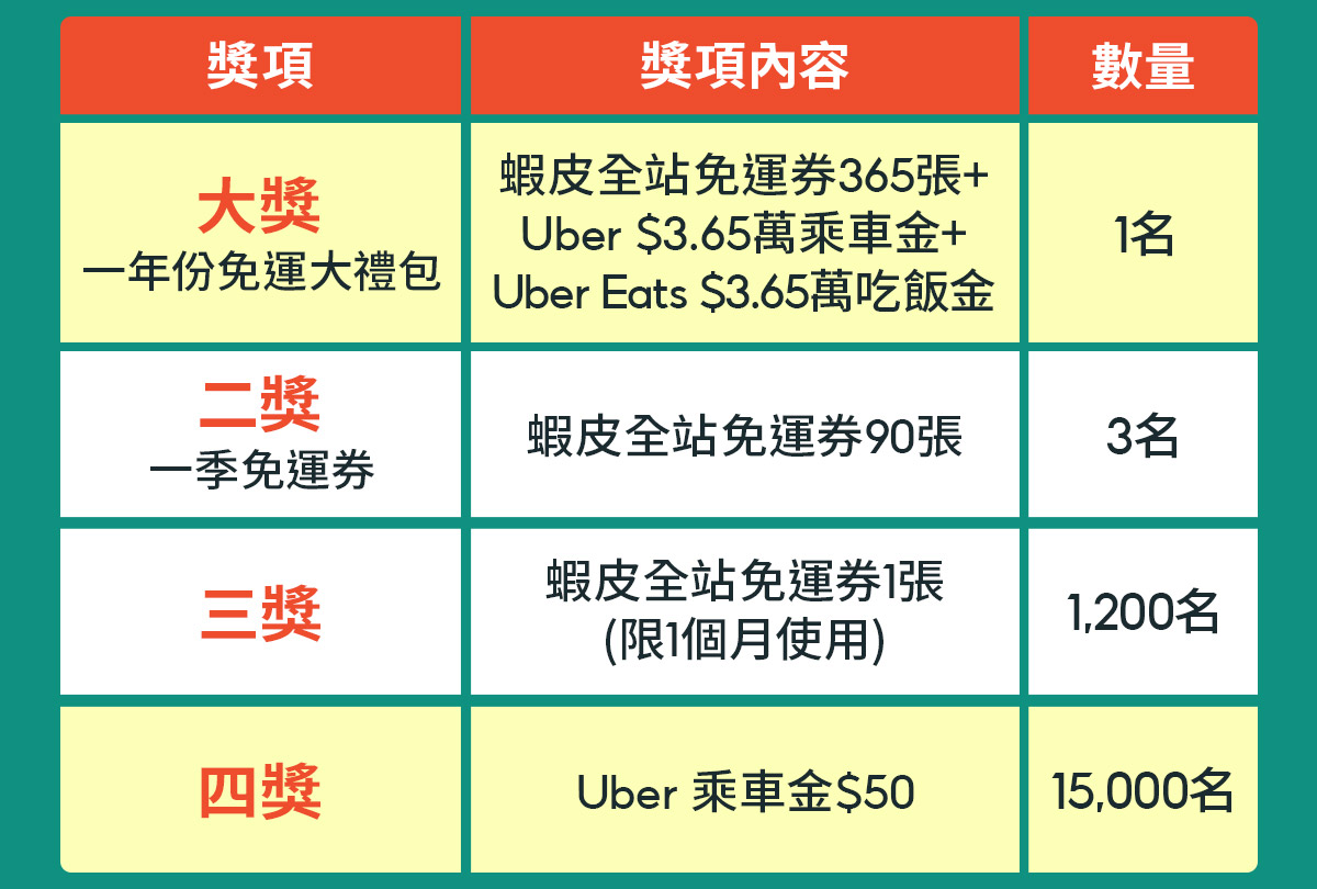 蝦皮XUber、Uber Eats獨家合作|下單抽一年份免運大禮包